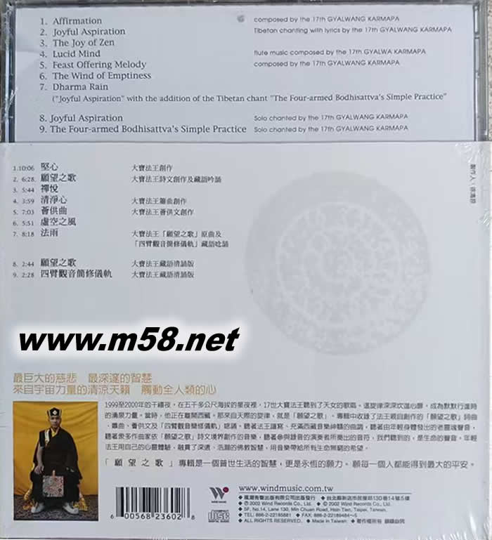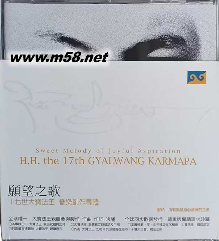 大寶法王 愿望之歌(m58.net) 「愿望之歌」專輯是一個永恒的愿力--愿每一個人都能得到最大的安定。 1999至2000年的千禧夜,在五千多公尺海拔的星夜里,17世大寶法王聽到了天女的歌唱。這旋律深深坎進心扉,成為默默行進時的涌泉力量。當時,他正在離開西藏。那來自天際的旋律,就是「愿望之歌」。專輯中收錄了法王親自創作的「愿望之歌」詞曲、簫曲、薈供文及「四臂觀音簡修儀軌」念誦。年輕法王用自己的心靈體驗,融貫了深遠、浩瀚的佛教智慧,用音樂帶給所有生命無窮的希望。