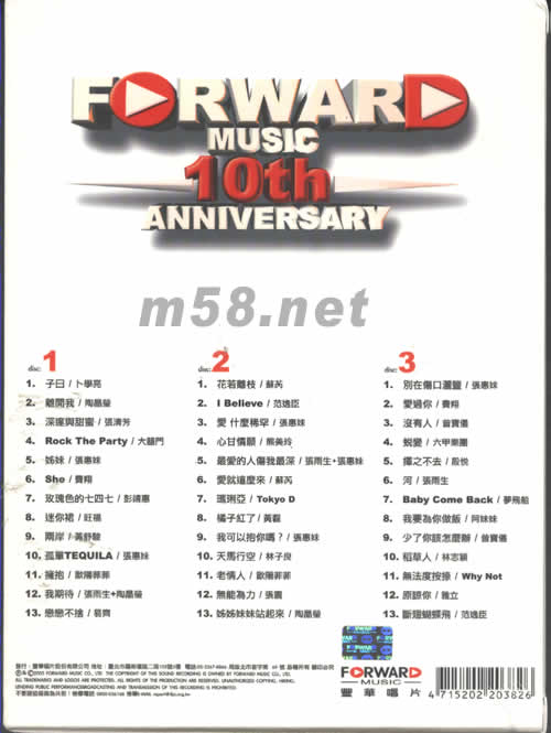 1 1、子日/卜學(xué)亮 2、離開我/陶晶瑩 3、深邃與甜蜜/張清芳 4、ROCK THE PARTY/大喜門 5、姐妹/張惠妹 6、SHE/費(fèi)翔 7、玫瑰的七四七/彭靖惠 8、迷你裙/旺福 9、兩岸/黃舒駿 10、孤單TEQUILA/張惠妹 11、擁抱/歐陽菲菲 12、我期待/張雨生+陶晶瑩 13、戀戀不舍/易 2 1、花若離枝/蘇芮 2、I BELIEVE/范逸臣 3、愛什么稀罕/張惠妹 4、心甘情愿/熊美玲 5、最愛的人傷我最深/張雨生+張惠妹 6、愛就這么來/蘇芮 7、瑪利亞/TOKYO D 8、橘子紅了/黃磊 9、我可以抱你嗎?/張惠妹 10、天馬行空/林子良 11、老情人/歐陽菲菲 12、無能為力/張震 13、姐姐妹妹站起來/陶晶瑩 3 1、別在傷口灑鹽/張惠妹 2、愛過你/費(fèi)翔 3、沒有人/曾寶儀 4、蛻變/六甲樂團(tuán) 5、揮之不去/ 殷悅 6、河/張雨生 7、BABY COME BACK/夢(mèng)飛船 8、我要為你做飯/阿妹妹 9、少了你該怎么辦/曾寶儀 10、稻草人/林志穎 11、無法度按捺/WHY NOT 12、原諒你/雅立 13、斷翅蝴蝶飛/范逸臣