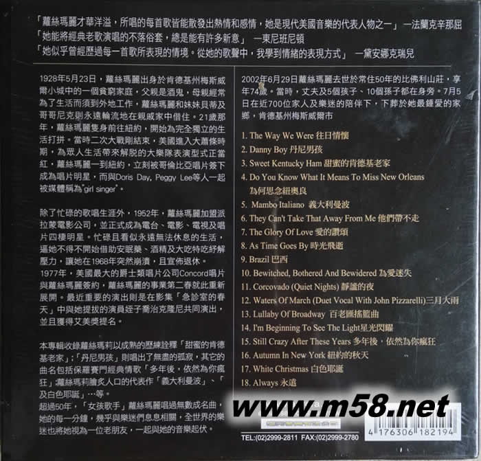 永遠的女孩歌手FOREVER GIRL SINGER (限量紀念版)(m58.net) 「蘿絲瑪麗才華洋溢,所唱的每首歌皆能散發出熱情和感情,她是現代美國音樂的代表人物之一」~法蘭克辛那屈 「她能將經典老歌演唱的不落俗套,總是能有許多新意」~東尼班尼頓 「她似乎曾經歷過每一首歌所表現的情境。從她的歌聲中,我學到情緒的表現方式」~黛安娜克瑞兒 本專輯收錄蘿絲瑪莉以成熟的歷練詮釋「甜蜜的肯德基老家」;「丹尼男孩」則唱出了無盡的孤寂,其它的曲名包括保羅賽門經典情歌「多年后,依然為你瘋狂」;蘿絲瑪莉膾炙人口的代表作「義大利曼波」、及「白色耶誕」。 超過50年,「女孩歌手」蘿絲瑪麗唱過無數成名曲,她的每一分鐘,幾乎與樂迷們息息相關,全世界的樂迷也將她視為一位老朋友,一起與她的音樂起伏。 2002年6月29日去世於常住50年的比佛利山莊,享年74歲。當時丈夫及5個孩子、10個孫子都在身旁。7月5日在近700位家人及樂迷的陪伴下,下葬於她最鐘愛的家鄉,肯德基州梅斯威爾市。