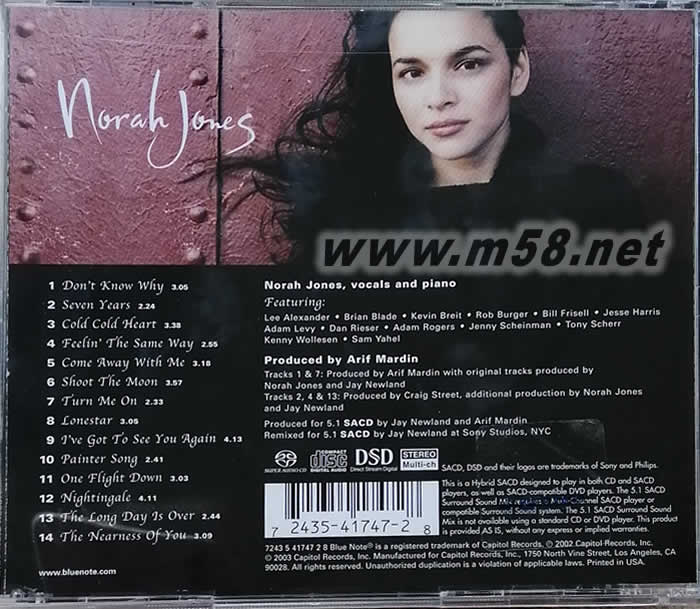 COME AWAY WITH ME SACD(m58.net) NORAH JONES的第一張個(gè)人專輯《Come Away With Me(遠(yuǎn)走高飛)》中,Norah展現(xiàn)出精湛的琴藝與迷人的嗓音,并邀請(qǐng)眾多中生代杰出音樂人,包括:吉他手Bill Frisell、鼓手Brian Blade與貝斯手Lee Alexander擔(dān)任伴奏。專輯同名曲“Come Away With Me”為四重奏編制的抒情慢板歌曲,Norah溫熟的嗓音表現(xiàn)頗有大將之風(fēng)......
