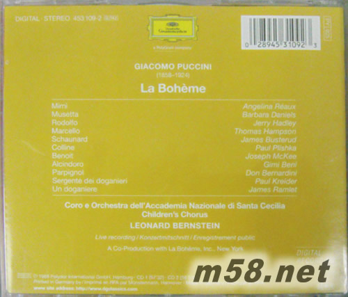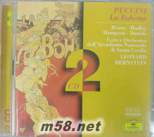 普契尼:波西米亞人-歌劇全曲Puccini:La Boheme (Complete Opera)(m58.net) 普契尼:歌劇《波西米亞人》全曲 / 伯恩斯坦指揮羅馬圣西西里音樂院管弦 PUCCIN : La Boheme / Leonard Bernstein & Coro e Orchestra dell’Accademia Nazionale di Santa Cecilia 《波西米亞人》是描寫巴黎地一群放蕩不羈藝術家之間的故事,全劇以詩人魯道夫與少女咪咪的愛情故事為主軸,百年來深受全球歌劇迷的喜愛。這是伯恩斯坦一九八八年的錄音,唯美的演出效果不禁讓人為之側目。在不搶奪歌手豐采的前提下,充滿節奏感與戲劇性的管弦樂很有可聽性。音樂整體性與結構十分完整,很少有這么脈絡清晰,獨唱者與合唱團的表現都非常稱職的演出。