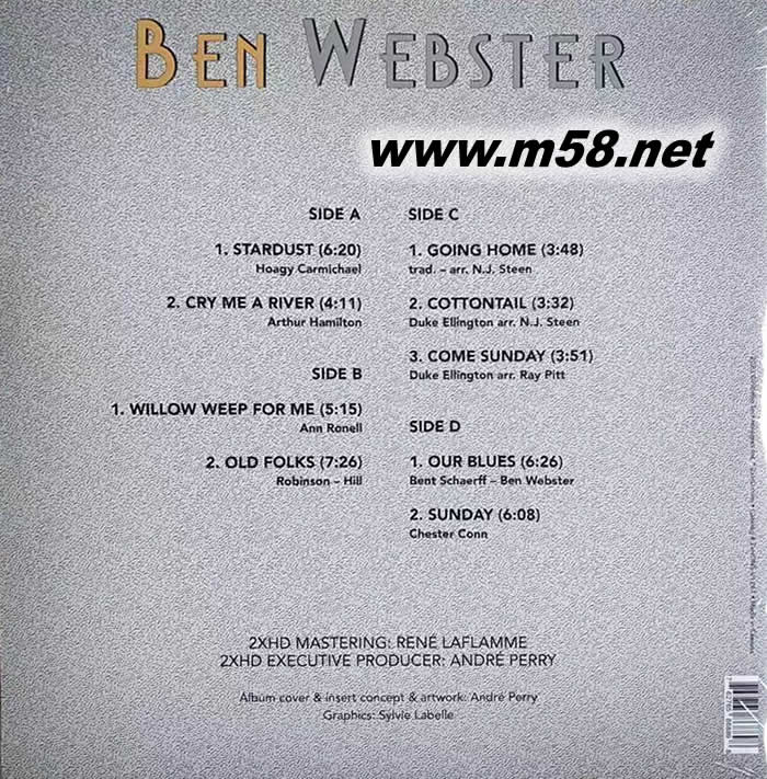 專輯錄音來自1964至1970年間,班韋伯斯特(Ben Webster)是一位獨特的爵士樂家,他充滿激情和強度的演奏,每個音符都體驗出其分量。在優(yōu)美歌謠式曲風昤,又變回美麗溫柔,每個音符都幾乎簡化到簡潔之境。9首作品,包括柔情萬縷,吹到口水花四濺之Stardust,吹出獨一無二感覺之經(jīng)典金曲Cry Me A River,感性作品Going Home,Duke Ellington艾靈頓大樂隊輕鬆作品Cotton Tail,Our Blues 更是 Ben Webster 令人回味,下班后藍調(diào)演奏風格之精選范例。加拿大2xHD使用Nagra銘器,利用原始類比母帶,全模擬AAA 100%制作,并在Bernie Grundman Studio (博尼·葛朗德曼錄音室)以45RPM進行剪輯。