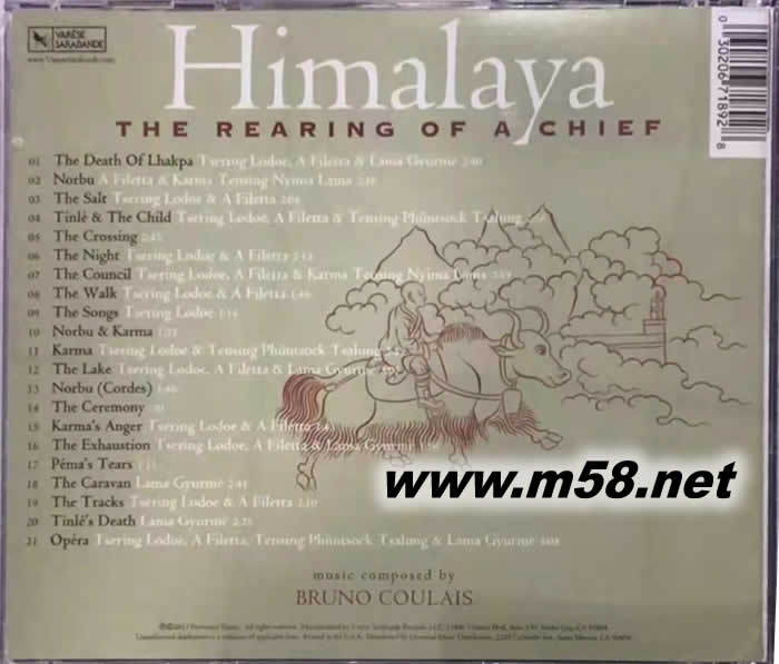Himalaya - The Rearing of a Chief 喜馬拉雅 電影原聲(m58.net) 喜馬拉雅》是一部由法國導演Eric Valli所執導的影片,描述在尼泊爾西北方一個名為Dolpo的偏僻村落的故事,除了真實呈現當地人生活方式及傳統風俗外,也再一次拍攝到這個西方人士眼中充滿宗教神秘色彩的世外桃源。為了更確切地表現部落的精神意涵,在這張原聲帶中作者特別安排了許多啟發冥想的音樂片斷,藉由獨特的歌聲、弦樂或是敲擊樂音的交錯重迭,羅織出異域邊境寂寥的風情。在這個有世界屋脊之稱的喜馬拉雅山脈中帶給世人的除了來自宗教上的豐富資源,同時也蘊含了無數天地宇宙間的神奇奧妙,無論是從電影或是從音樂的媒介,我們都一窺其中的堂奧. 本張原聲帶的作曲是法國新銳音樂家Bruno Coulais,它所創作的“天·地·人”三部曲包括:講述鳥兒飛行夢想的紀錄片《遷徙的鳥 (Le Peuple Migrateur, Travelling Birds)》、展現蟲子們幸福生活的電影《微觀世界 (MICROCOSMOS)》,以及贊美人類與自然血脈相連的故事片《喜馬拉雅 (HIMALAYA)》。 原聲極具西藏風情,清晰的鼓點和明朗的哼唱在眼前展現的世一幅空曠美麗的畫面。西藏依舊神秘,只是我們的心在逐漸超脫。