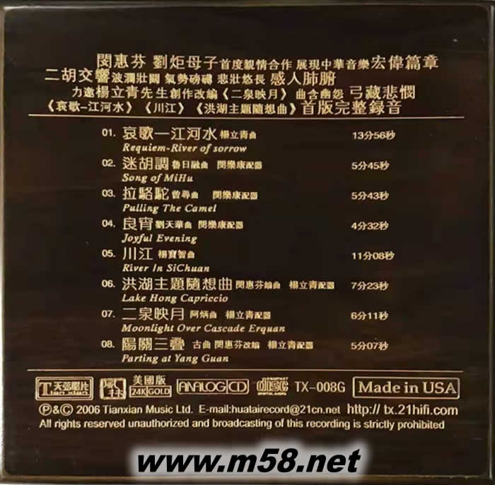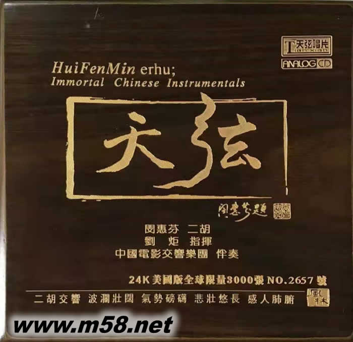 天弦 金碟(m58.net) 盡管許多發燒友都收有不止一張閔惠芬的二胡獨奏CD專輯,但近日問世的這張由她本人題寫碟名的《天弦》,仍值得第一時間擁有———這既是二胡與交響樂的合作,也是閔惠芬與兒子劉炬首度親情攜手的結晶。 二胡是典型的中國民族樂器,交響樂隊乃十足的洋樂,洋為中用,兩相交融,是二胡大師閔惠芬在演奏藝術上的一次創舉性探索?!短煜摇啡彩涨堪耸?,既有根據東北 民間笙管曲以協奏曲形式創編的《哀歌—江河水》,也有將二胡經典曲目重新編配的《二泉映月》、《良宵》,還有分別用古曲、現代歌劇、陜西民間小戲素材改編的《陽關三迭》、《洪湖主題隨想曲》和《迷胡調》以及原創性作品《川江》等。題材多樣,風格各異。 在這張專輯中,閔惠芬的演奏爐火純青、出神入化,情感氣勢與神韻合而為一,一弓一音都關情。而中央芭蕾舞團常任指揮劉炬執棒中國電影交響樂團的伴奏,以百多號人馬的交響樂隊在音響配置上營造出豐富性和多維性,拓展了二胡的音樂表達空間。值得一提的是,此碟還運用了XRCD24(超解析力24比特)的技術進行錄制,聲音通透均衡空氣感強,層次分明聲場深后,音樂味濃,夠“發燒”。
