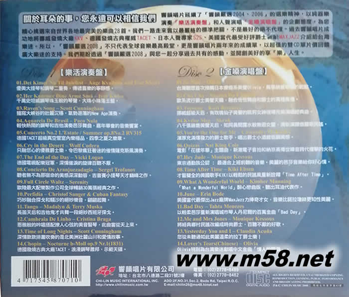 在這套雙CD的精選中,我們延續了「響韻嚴選2004」、「響韻嚴選2006」的選樂精神,以純器樂演奏「樂活演奏盤」和人聲演唱「金嗓演唱盤」的企劃態度,為您精心挑選來自世界各地最完美的樂曲28首。身為全臺評價最高的唱片公司,響韻唱片一路走來皆以最嚴格的標準把關,不是最好的絕不代理。過去響韻唱片成功將挪威發燒大廠KKV、德國發燒古典權威TACET、日本人聲專家S2S、美國當代最受好評爵士新廠Maxjazz以及其他多家優質的唱片公司介紹給臺灣樂迷。所以,這一套「響韻嚴選2008」不只代表了全球音樂最高殿堂,更是響韻唱片兩年來的成績單,以超值的雙CD單片價回饋廣大樂迷的支持。