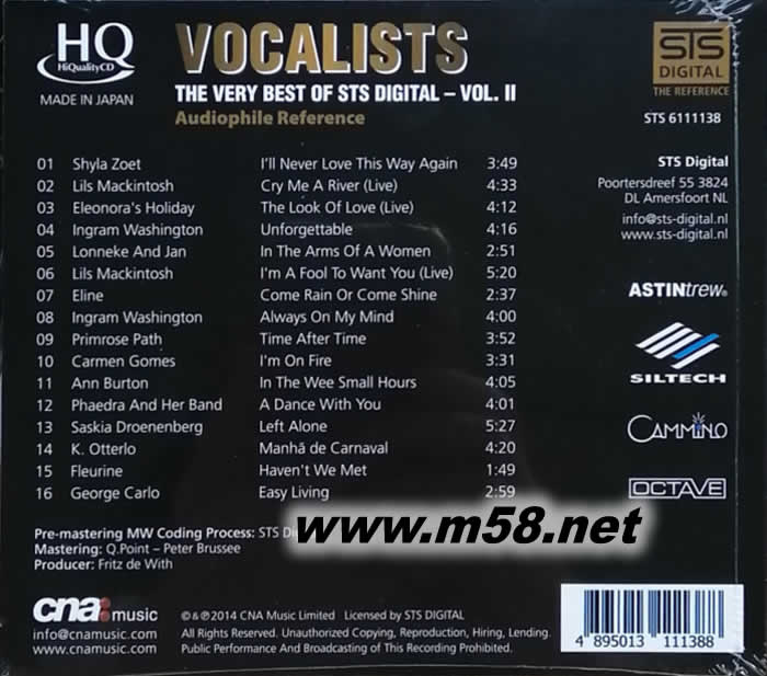 相隔5年荷蘭發燒品牌STS Digital再度推出超級精選第2輯,精挑細選16首最靚聲,最動人出色的歌唱作品,STS DIGITAL最為人所熟悉,它代表著發燒天碟錄音,錄音和后期製作技術更是業界先驅。打從STS DIGITAL推出MWCodingProcess?首張作品后,發燒友均讚不絕口、全力追捧和收藏。今個秋季,超級精選2 超靚人聲專集受惠於這編碼技術,人聲比原作品更溫暖豐厚,像似黑膠唱片聲音,動態更不可思議地寬闊,音樂細致之處更勝從前。Made in Japan日本印碟HQCD (HiQuality CD),絕對值得收藏。