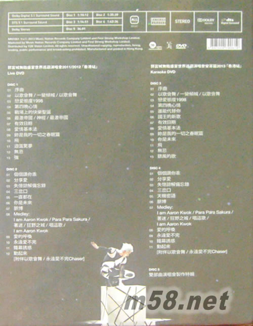郭富城舞臨盛宴世界巡迴演唱會2011/2012 [香港站] (視聽版) Live 2 DVD DVD 1 01. 序曲 02. 以歌會舞 / 一變傾城 / 以歌會舞 03. 戀愛態(tài)度1998 04. 第四晚心情 05. 戰(zhàn)場上的快樂圣誕 06. 最激帝國 / 神經(jīng) / 最激帝國 07. 有效日期 08. 愛情基本法 09. 妳是我的一切之春眠篇 10. 飛 11. 游園驚夢 12. 強 DVD 2 01.個個贊你乖 02.分享愛 03.失憶諒解備忘錄 04.三岔口 05.一直都在 06.你是未來 07.脈博 08. Medley: I am Aaron Kwok / Para Para Sakura / 著迷 / 狂野之城 / 唱這歌 / I am Aaron Kwok 09. 愛的呼喚 10. 鐵幕誘惑 11. 鐵幕誘惑 12. 動起來 (附伴以歌會舞 / 永遠愛不完Chaser) 郭富城舞臨盛宴世界巡迴演唱會安哥篇2013 [香港站] (附有KARAOKE字幕) Karaoke 2DVD DVD 3 01. 序曲 02. 以歌會舞 / 一變傾城 / 以歌會舞 03. 戀愛態(tài)度1998 04. 第四晚心情 05. 誰能代替你 06. 國王的新歌 07. 有效日期 08. 愛情基本法 09. 妳是我的一切之春眠篇 10. 你是未來 11. 飛 12. 無忌 13. 聽風(fēng)的歌 DVD 4 01. 個個贊你乖 02. 分享愛 03. 失憶諒解備忘錄 04. 三岔口 05. 天機密語 06. 脈博 07. Medley: I am Aaron Kwok / Para Para Sakura / 著迷 / 狂野之城 / 唱這歌 + I am Aaron Kwok 08. 愛的呼喚 09. 永遠愛不完 10. 鐵幕誘惑 11. 動起來 [附伴以歌會舞 / 永遠愛不完Chaser) DVD 5 雙部曲演唱會制作特輯 (34mins)