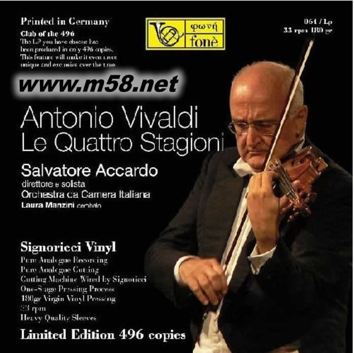 意大利小提琴一代宗師阿卡多(Salvatore Accardo)擁有超然的樂壇地位,出神入化的琴技往往令人聽得熱血沸騰渾身充滿動感,仿如人琴合一般的演奏絕對無人能及,技術銳不可擋。17-18世紀叱吒古典樂界的風云人物之一的維瓦爾第(Antonio Vivaldi)出身自音樂世家,自小跟隨父親學習小提琴,是巴洛克鼎盛時期意大利著名的作曲家、小提琴家和音樂教育家,而首本名曲[四季(The Four Seasons)]更瘋魔全球同時亦奠定他在國際樂壇上的崇高地位及影響力,亦被譽為”協奏曲之父”。縱然市面上已有很多不同的[四季]錄音版本,但這次由意大利極負盛名的發燒品牌<豐力(Fone)>著名錄音師里奇(Giulio Cesare Ricci)親自監製,由阿卡多伙拍"意大利電影樂團(Orchestra da Camera Italiana)"與及杜西馬琴(羽管鍵琴)演奏家羅娜.曼仙妮(Laura Manzini)帶來前所未有、最完美無瑕的版本,最新的錄音技術配合以33 1/3轉、180克,處女膠為載體、全球限量496張黑膠盤發行,極之珍貴!