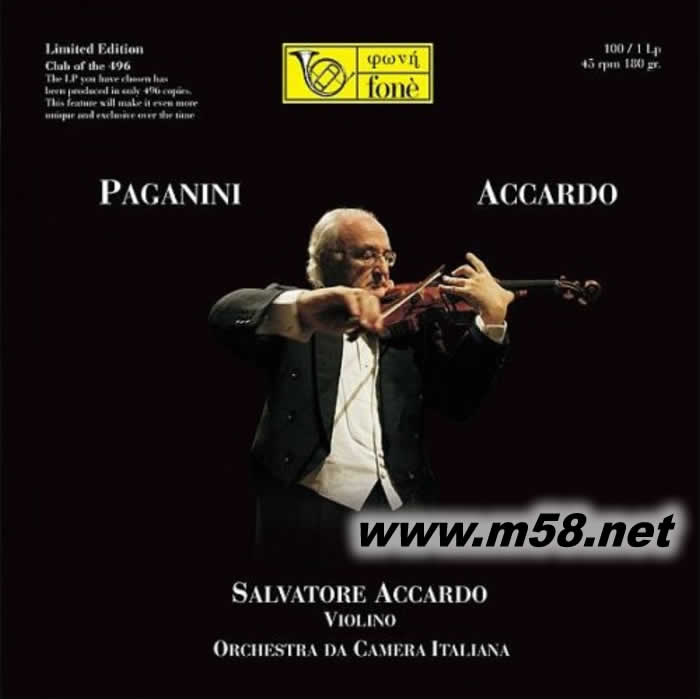 阿卡多[帕格尼尼作品選] Salvatore Accardo [Paganini] 180g 33RPM LP 黑膠(m58.net) 1. 意大利小提琴一代宗師阿卡多(Salvatore Accardo)採用 絕世名琴由斯特拉迪瓦里(Antonio Stradivari)於1727年製 造之「弗蘭切里卡蒂(‘Hart’ex Francescatti)」演奏。 2. 阿卡多以出神入化的琴技配合最珍貴、極富歷史的名琴將這兩首樂章全力演繹,弦聲如行云流水,變化多端,使人著迷。