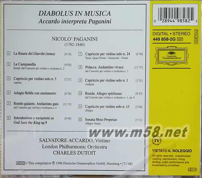魔鬼的顫音DIABOLUS IN MUSICA(24K金碟日本版)古典愛(ài)好者必備(m58.net) 專輯收錄了10余首帕格尼尼的作品,有名的大概都在其中了。 早年的阿卡多火爆生猛,手中名琴迸發(fā)出的琴聲華麗雄壯,光輝甜美,令人難以忘懷。 這是DG皇牌錄音師Gunter Hermanns親自所錄的杰作之一。碟中獨(dú)奏部分音色通透,琴聲細(xì)節(jié)分明、空氣感強(qiáng),片中小提琴和打擊樂(lè)的高頻泛音極為豐富,足以試出音響系統(tǒng)中的任何瑕疵。