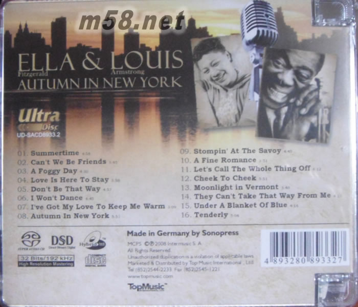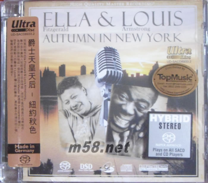 Autumn in New York 紐約秋色 爵士天皇天后 SACD(m58.net) 完美的組合ELLA FITZERALD — LOUIS ARMSTRONG 集合多年廣為人知經典爵士名曲16首,采用采進名器進行母帶制作,為求原汗原味制成一張完美DSD MASTER SONOPRESS 壓片。 ELLA 溫婉動人的聲音,LOUIS 鵝公喉的聲音,還有拿手而搶耳的小號,發燒友們怎能不動容呢?