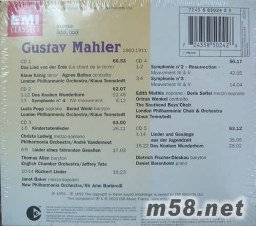 Mahler Gustav Lieder 馬勒鋼琴作品集5CD套裝專輯背面圖片