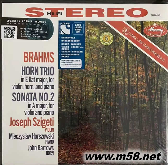 勃拉姆斯:小提琴奏鳴曲/圓號(hào) 鋼琴三重奏 BRAHMS HORN TRIO 黑膠(m58.net) 美國(guó)MERCURY LIVING PRESENCH經(jīng)典錄音,圓號(hào)演奏抒情,音色圓潤(rùn),小提琴冷靜清晰,鋼琴音色結(jié)構(gòu)厚重,氣勢(shì)龐大。加上默契的配合,180克黑膠。