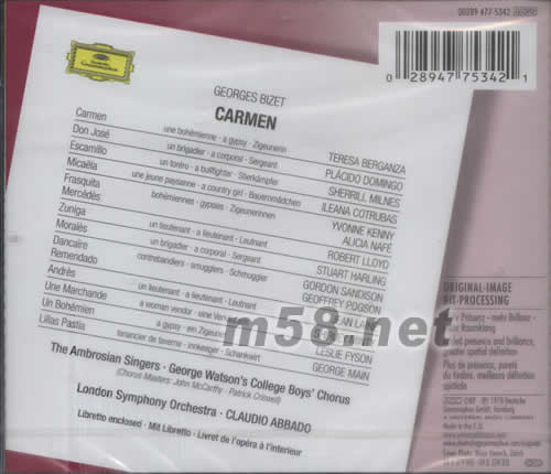 這套《比才:卡門》由DG唱片公司發(fā)行于2005年,克勞迪奧?阿巴多指揮倫敦交響樂(lè)團(tuán)演奏錄制,普拉西多?多明戈、泰蕾莎?貝爾岡薩等演唱。