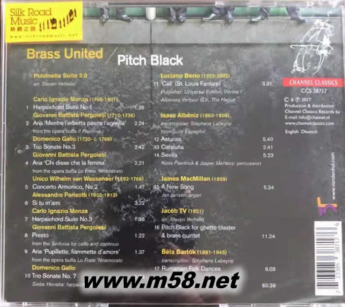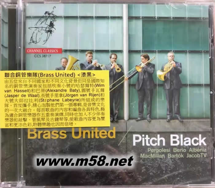 漆黑Pitch Black(小號、長號、大號五重奏)(m58.net) 聯(lián)合銅管樂隊演奏,哈瑟爾特/巴蒂小號,瓦爾圓號,里拿長號、拉比利大號,以精湛的吹奏法演繹18-20世紀多位作曲家歌曲,旋律優(yōu)美,充滿動感。加入敲擊、管風琴等伴奏樂器,更添色彩。 Brass United : Wim van Hasselt (trumpet)、Alexandre Baty (trumpet)、 Jasper de Waal (horn)、Jörgen van Rijen (trombone)、 Stéphane Labeyrie (tuba) 1. 五位來自不同國家和不同文化背景但同是國際知名的銅管樂演奏家包括吹奏小號的維姆•凡•哈瑟爾特(Wim van Hasselt)和亞歷山大•巴蒂(Alexandre Baty),圓號手賈斯珀•德•瓦爾(Jasper de Waal),長號手喬根•凡•里拿(Jörgen van Rijen)和大號大師斯特凡•拉比利(Stéphane Labeyrie)所組成的「聯(lián)合銅管樂隊(Brass United)」首度攜手,精心泡製他們第一張專輯[漆黑(Pitch Black)],是音樂文化的一次大融合。 2. 樂隊每一隊員皆使出渾身解數,各展所長,以精湛的吹奏技巧演繹六位名作曲家的雋永作品,歌曲旋律優(yōu)美,充滿動感。 3. 每首歌曲的內容和編曲各具特色,極為適合銅管樂器作五重奏演繹,同時也加入不少伴奏樂器如敲擊、管風琴及古鍵琴等,使歌曲內容更為豐富和更添色彩,聆聽樂趣也因而倍增。