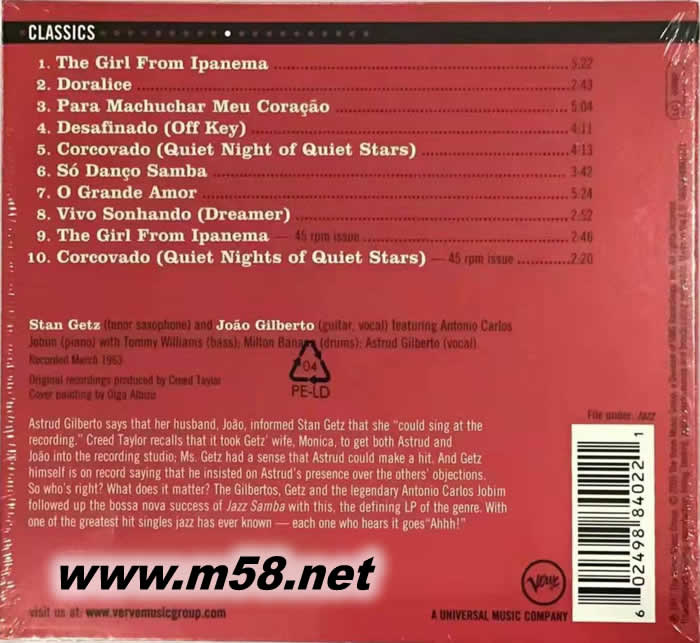 Getz/Gilberto 蓋茨/吉巴托(m58.net) Bossa Nova是融合巴西桑巴舞曲和美國西岸冷爵士的一種“新派爵士音樂”,它自50年代末期在巴西興起,成為五六十年代巴西新流行音樂的代名詞。《蓋茲/吉巴托》大概是Bassa Nova史上最暢銷的一張唱片,企鵝爵士評鑒5顆星,《重拍》雜志評介4顆半星,專輯由三位大師級音樂家聯合灌錄,他們分別是薩克斯風手斯坦?蓋茲、巴西歌手喬阿?吉巴托和作曲家Antonio Carlos Jobim,還有喬阿?吉巴托的妻子Astrud Gilberto也參與了合作。 斯坦?蓋茲毫無疑問是位Jazz巨人,他的薩克斯風吹奏猶如情人的低迴耳語,每每溫暖人心,但他音樂本身存在的問題也是明顯的,有人指摘他在作品原創性上的不足,那些膾炙人口的曲子大都是改編自其他人的作品或民間歌曲,然而令人驚嘆的是別人的曲子經過他的編排與演奏,出來的爵士效果竟是如此的地道和精純,讓人萬分著迷。他在專輯中每一段即興演出,旋律優美而令人不由自主的跟著低吟,在吉他的節奏音響之上觸發聽者進入更上一層的情緒。 少了現代電子合成的華麗配樂,人聲顯得尤為重要,那時的Bossa Nova樂界也有一個女王,她就是Astrud Gilberto。在《蓋茲/吉巴托》的部分曲目中獻聲的女歌手Astrud Gilbert慵懶迷人的嗓音線,配上優美的旋律和搖擺的節奏,難怪Bossa Nova能輕易占據了樂迷們的心。然而事實上最初的Bossa Nova遠沒有現在這般味道濃烈,比起小野麗莎、鈴木重子那些充滿甜美浪漫氣息的歌曲,它們顯得相當“清淡”,優雅地泛著淡淡的哀愁。 Astrud Gilberto進入爵士樂界的故事也相當傳奇。當時錄制《Getz/Gilberto》時,制作人為了讓這張專輯里的音樂更容易被美國聽眾接受,需要在主打歌曲《來自伊帕尼瑪的女孩》里加入一些英文歌詞。然而喬阿?吉巴托不會英語,斯坦?蓋茲便提議讓Astrud Gilberto來演唱其中的英文歌詞。于是在這偶然的機會下,Astrud Gilberto在這張舉世聞名的經典爵士唱片中亮出了她柔美而獨特的嗓音,若有若無的隱約美感,讓全世界都為之驚艷!Astrud的聲線以及她的演唱風格在當時是很特別的,慵懶愜意,感性而又漫不經心,不同于其他主流爵士女歌手。《來自伊帕尼瑪的女孩》這首名曲進而成為拉丁爵士乃至整個爵士樂界的傳奇,成為被世界各地的爵士樂迷傳頌了將近40年,仍使人們對其念念不忘的Bossa Nova經典。 薩克斯風手斯坦?蓋茲在爵士樂領域是旋律即興的代表人物。斯坦?蓋茲演奏的最大特色在于節奏運用的巧思。斯坦?蓋茲卻在演奏當中保留Bebop的特殊斷句效果,并且在旋律當中一并加入這些自然的斷句或斷奏,使得他吹的薩克斯風聽起來即使沒有鼓韻也相當豐富。如此一來,薩克斯風的吹奏又多出許多風格變數。輕聲的顫音與慵懶閑散的音質,成為斯坦?蓋茲為爵士樂譜下個人風格的絕佳典范。他雖然經歷搖擺樂和Bebop的洗禮,卻不曾迷失在因襲傳統或鼓噪式的煽情中,只要他的樂聲一起,凝聚在恣意閑情的旋律和拖曵慢調的節拍,就立即捕捉了聽者的想象。 Verve這家老牌美國唱片公司創辦于1944年7月,創辦人是前米高梅影業公司的電影剪輯師諾爾曼?格蘭茲(Norman Granz)。經過近60年的發展變遷,如今隸屬于環球音樂集團的Verve已經成為世界上歷史最悠久、聲名最卓著、簽約音樂家陣容最強大、出品最豐富、附屬子廠牌最多、影響最大的爵士樂唱片公司之一。Verve唱片公司的出品風格也經歷了從單純傳統爵士樂派到現代與傳統各種爵士流派相融合的風格演變過程,如今的Verve唱片,從新奧爾良爵士、搖擺樂、波普爵士、清涼爵士、西岸爵士、自由爵士、拉丁爵士、酸性爵士到融合爵士應有盡有,而且很可能找得到您所想得到的任何爵士名家的錄音專輯。