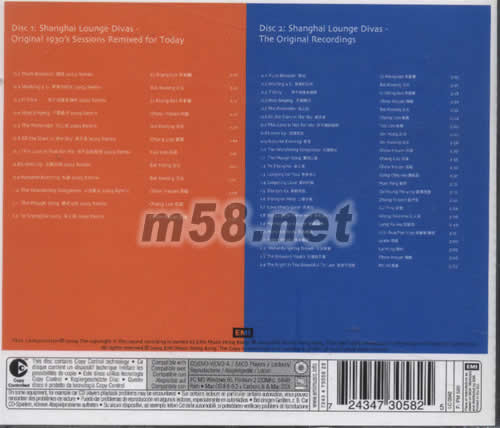 Disc 1: Shanghai Lounge Divas - Original 1930's Sessions Remixed for Today ihnb5m0.1 Plum Blossom 梅花2003 Remix Li Xiang-lan李香蘭 l2 U|j#iy 0.2 Waiting 4 U 等著你回來2003 Remix Bai Kwong白光 x7dLXI 0.3 If Only… 恨不相逢未嫁時2003 Remix Li Xiang-lan李香蘭 0g:f XV 0.4 Stop Singing 不要唱吧2003 Remix Chow Hsuan周璇 gHH #R*/dD 0.5 The Pretender 假正經2003 Remix Bai Kwong白光 &-E;5n=pI 0.6 All The Stars In The Sky 滿天星2003 Remix Chang Loo張露 qzooL1h 0.7 This Love Is Not For Me ?)(gAUZcV 得不到的愛情2003 Remix Yao Lee姚莉 jtr:#,PK 0.8 Listen Up 且聽我說2003 Remix Bai Hong白虹 p$H C?Rt 0.9 Autumn Evening 秋夜2003 Remix Bai Kwong白光 xB1- ^RX 1.0 The Wandering Songstress =[,,NQ^ 天涯歌女2003 Remix Chow Hsuan周璇 ](X[OI?1 1.1 The Plough Song 鋤頭山歌2003 Remix Chang Loo張露 Rz)=]x_&K~ 1.2 Ye Shanghai 2003 夜上海2003 Remix Chow Hsuan周璇 O'`c%PDu'sTs2 Disc 2: Shanghai Lounge Divas - The Original Recordings I{LOW 9R 0.1 Plum Blossom 梅花 Li Xiang-lan李香蘭 9UG0/_%! 0.2 Waiting 4 U 等著你回來 Bai Kwong白光 ;2;z3(9 0.3 If Only… 恨不相逢未嫁時 Li Xiang-lan李香蘭 OMJ!r~/K 0.4 Stop Singing 不要唱吧 Chow Hsuan周璇 Y][D=K[ 0.5 The Pretender 假正經 Bai Kwong白光 Lv d v8 0.6 All The Stars In The Sky 滿天星 Chang Loo張露 F/ Vg<< 0.7 This Love Is Not For Me 得不到的愛情 Yao Lee姚莉 &!2=oHwe~ 0.8 Listen Up 且聽我說 Bai Hong白虹 3a2cmL7= 0.9 Autumn Evening 秋夜 Bai Kwong白光 ]:dv 'm 1.0 The Wandering Songstress 天涯歌女 Chow Hsuan周璇 K\+ iD{ 1.1 The Plough Song 鋤頭山歌 Chang Loo張露 n>&4{V8' 1.2 Ye Shanghai 2003 夜上海 Chow Hsuan周璇 `Y>wwU|X$ 1.3 Longing For You 秋水伊人 Gong Chio-xia龔秋霞 *5[Lp-c 1.4 Lingering Love 愛的流連 Man Ping曼萍 '3k *nT1 1.5 Shangri-La 香格里拉 OuYoung Fei-ying 歐陽飛鶯 GVVIecH4/ 1.6 Shanghai Miss 上海小姐 Zhang Yi-wen張伊雯 U7L&J>f0 1.7 Love That's Gone 霓裳恨 Gu Ying谷鶯 }"FI+^<~y? 1.8 Song Of The Fisherman 漁光曲(一) Wang Ren-mei王人美 fI P yka I 1.9 Harmonious Couple 鸞鳳諧鳴 Lang Yu-xiu郎毓秀 z$\V? j 2.0 Hundred Birds 百鳥朝凰 Li Li-hua/Yan Hua 李麗華/嚴華 R)J]Zd P 2.1 Fallen Petals 落花飄零 Lu Min璐敏 &O>V.R^GEj 2.2 Heavenly Spring Dream 天堂春夢 Lu Ming路明 iGAlE 2.3 The Blossom Youth 花樣的年華 Chow Hsuan周璇 f7- 1 2.4 The Night Is Too Beautiful To Last 良夜不能留 Pei Ni佩妮