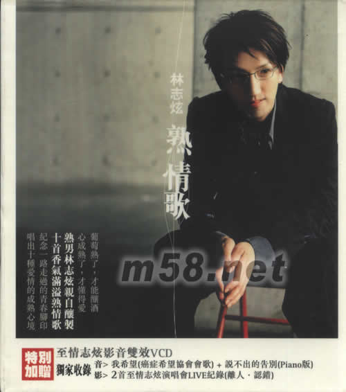 熟情歌(首批影音雙效版)(m58.net) 葡萄熟了才能釀酒,心成熟了才懂得愛(ài)。林志炫親自釀制,十首香氣滿(mǎn)溢《熟情歌》,紀(jì)念一路走過(guò)的青春腳印,唱出十種愛(ài)情的成熟心境,因此命名新碟為《熟情歌》。「說(shuō)不出的告別」乃林志炫為回憶而創(chuàng)作之《熟情歌》,紀(jì)念那份珍藏的愛(ài)。此曲鋼琴版亦了輯錄于《至情志炫影音雙效》VCD內(nèi)。 在《至情志炫影音雙效》VCD中,林志炫高唱為臺(tái)灣癌癥病患打造的歌曲「我希望」,為患者加油打氣,氣氛溫馨;碟內(nèi)還收錄《至情志炫演唱會(huì)》Live紀(jì)錄中兩支歌曲︰「離人」及「認(rèn)錯(cuò)」。 前「優(yōu)克李林」主音林志炫 2005 年憑著《至情志炫》專(zhuān)輯,再次入圍了金曲獎(jiǎng)最佳國(guó)語(yǔ)男歌手,他這幾年一直以獨(dú)立制作的方式經(jīng)營(yíng)自己的歌唱事業(yè),作品一再獲得金曲評(píng)審的肯定,各位又豈能錯(cuò)過(guò)林志炫的「熟男」心聲!