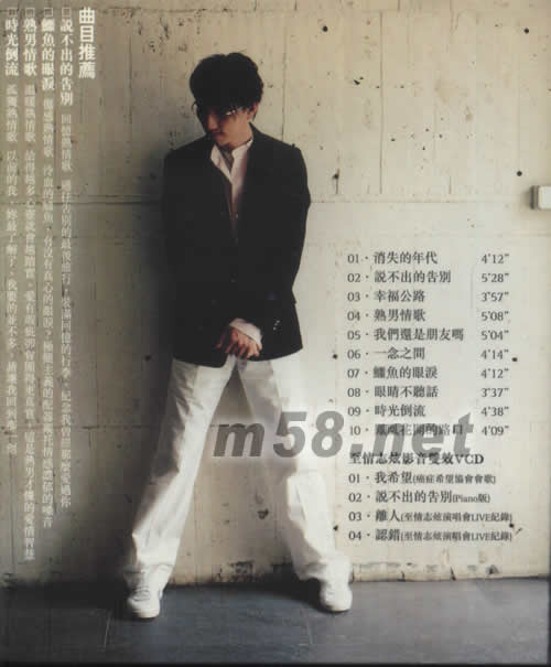 CD 01. 消失的年代 02. 說(shuō)不出的告別 03. 幸福公路 04. 熟男情歌 05. 我們還是朋友嗎 06. 一念之間 07. 鱷魚(yú)的眼淚 08. 眼睛不聽(tīng)話 09. 時(shí)光倒流 10. 鳳凰花開(kāi)的路口 VCD - 至情志炫影音雙效VCD 01. 我希望 (癌癥希望協(xié)會(huì)會(huì)歌) 02. 說(shuō)不出的告別 (Piano版) 03. 離人 (至情志炫演唱會(huì)Live紀(jì)錄) 04. 認(rèn)錯(cuò) (至情志炫演唱會(huì)Live紀(jì)錄)
