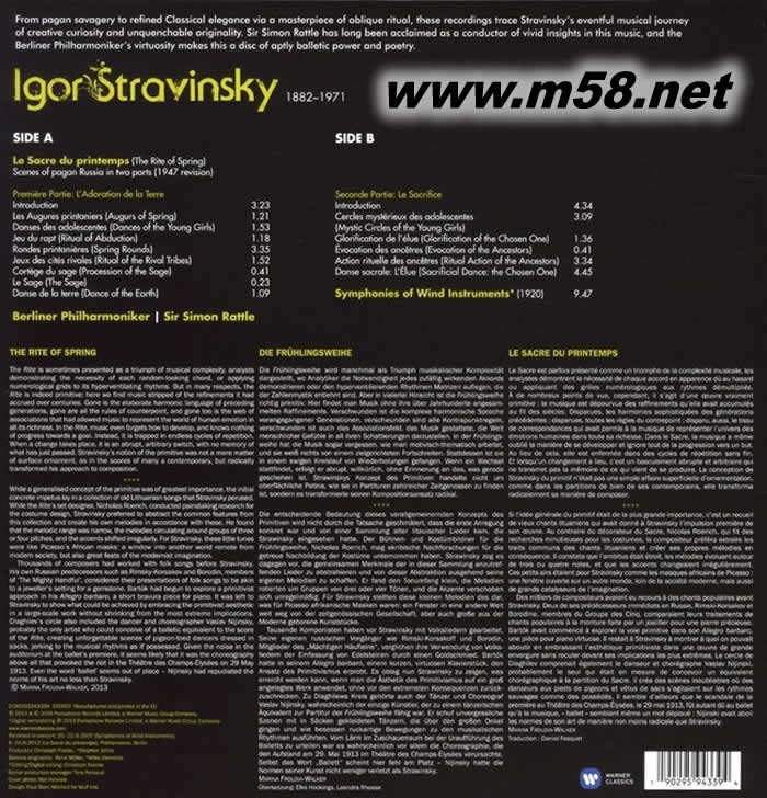 西蒙 拉特爾 斯特拉文斯基 春之際 Stravinsky: The Rite of the Spring 180g 33RPM LP 黑膠(m58.net) 1913年5月29日,史特拉汶斯基的《春之祭》在巴黎首演,引起音樂(lè)史上著名的暴動(dòng)。音樂(lè)描寫(xiě)的是史特拉汶斯基腦中一閃而過(guò)的景象:「長(zhǎng)老圍坐成一圈,注視一個(gè)年輕姑娘跳舞至死。他們把這個(gè)少女當(dāng)成犧牲獻(xiàn)給春神」。在俄羅斯芭蕾舞團(tuán)經(jīng)理賈吉列夫的委託下,史特拉汶斯基把它寫(xiě)成舞劇音樂(lè),但是,當(dāng)時(shí)的聽(tīng)眾完全無(wú)法接受音樂(lè)里衝撞的和弦、調(diào)性與節(jié)奏。不過(guò)一百年后,《春之祭》已經(jīng)成為史特拉汶斯基的代表作。