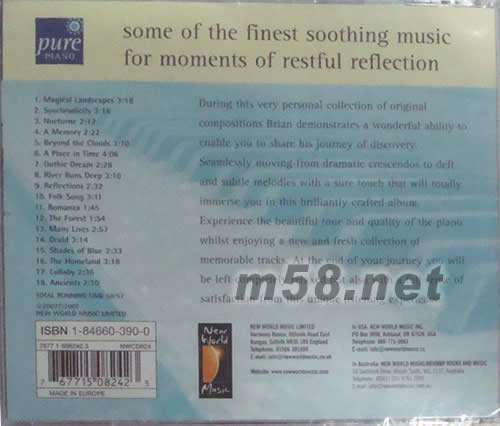 純鋼琴之音 PURE(m58.net) 純鋼琴之音 由英加 New world 公司旗下的鋼琴及制作家Brian king 親自編作及演奏18首聽郵耳油的鋼琴作品,首首觸動(dòng)心靈,這是張可把心靈釋放的最佳音樂選擇 !