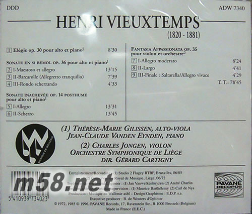 Henri Vieuxtemps(1820-1881)比利時的小提琴家及作曲家,師事雷克洛斯、迪瓊克、白里奧等三位,14歲在維也納獨奏貝多芬小提琴協奏曲一鳴驚人,1835年師事雷恰后逐展開歐洲表演,他的作品是學習小提琴的示范教本,又吸收蘇俄小提琴樂派的精華,成為舉世聞名之大師,主掌法比小提琴樂派。本片的哀歌、奏鳴曲等為中提琴及小提琴曲,都是市上少見,旋律美好、精致優美的曲目,第四首加上小提琴及管弦樂的幻想曲,聲勢浩大,琴聲感人的至佳名曲。