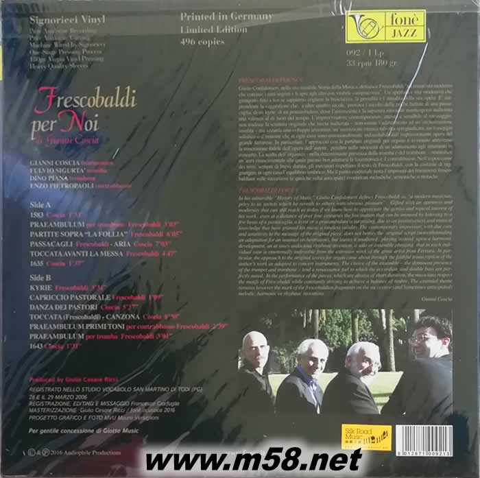 詹尼科夏[向我們的弗科保爾迪致敬] Gianni Coscia [Frescobaldi Per Noi 爵士四重奏 手風(fēng)琴 大提琴、長(zhǎng)號(hào)、小號(hào) 黑膠(m58.net)