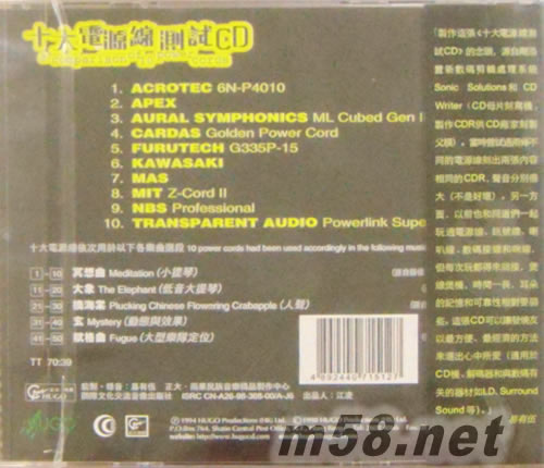 A Comparison Of Ten Power Cords十大電源線測試CD(m58.net) 1、系器材測試CD,5首樂曲都是片段,不完整。 2、因為要用10種不同電源線測同一首樂曲的效果,所以每段將重復(fù)10遍。 3、在多媒體音響上聽APE,區(qū)別可能不明顯。 電源線: 1、ACROTEC 6N-P4010 2、APEX 3、AURAL SYMPHONICS ML Cubed Gen IIi 4、CARDAS Golden Power Cord 5、FURUTECH G335P-15 6、KAWASAKI 7、MAS 8、MIT 9、NBS 10、TRANSPARENT AUDIO
