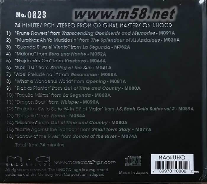 01. “Prune Flowers”- from Transcending Continents and Memories-M091A 02. “Murakkaz Ah Ya Muddasin” - from The Splendour of Al Andalous - M026A 03. “Cuando Silva el Viento” - from La Segunda - M062A 04. “Malena” - from Sera una Noche - M052A 05. “Gajdarsko Oro” - from Krushevo - M044A 06. “April 1st” - from Staring at the Sun - M041A 07. “Abel Prelude no 1” - from Resonance - M088A 08. “What a Wonderful World” - from Opening - M081A 09. “Plocka Plantor” - from Out of Time and Country - M080A 10. “Taquito Militar” - from La Segunda - M062A 11. “Dragon Boat”from Whisper-M090A 12. “Prelude - Cello Suite #4 in E Flat Major” - from J.S. Bach Cello Suites vol 2 - M089A 13. “Chiquita” - from Nama - M084A 14. “Miserere” - from Out of Time and Country - M080A 15. “Battle Against the Typhoon” - from Small Town Story - M077A 16. “Sorrow of the River” - from Sorrow of the River - M074A