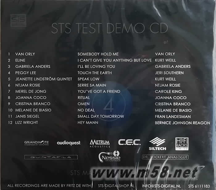 STS TEST DEMO CD 4 馬蘭士年度精選2019音響器材專屬示范天碟(m58.net) 音響器材專屬示范天碟 MW Coding Process 模擬編碼技術打造 音色無與倫比 “年度精選2019”是STS Digital最發燒錄音作品,能被挑選在本碟內的歌曲,無論在音樂或音效,均是數一數二絕頂發燒,“年度精選2019”絕對是每一位發燒友最值得期待的精選專集。