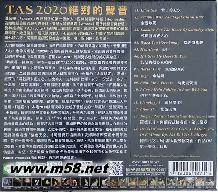 TAS 絕對(duì)的聲音CD 2020(m58.net) 潘朵拉(Pandora) 天神創(chuàng)造的第一個(gè)女人,匠神赫菲斯特斯(Hephaestus)為她雕塑美麗的臉孔與身材,智慧女神雅典娜(Athena)賜予她藝術(shù)與智慧,愛(ài)神維納斯(Aphrodite)為她噴上銷(xiāo)魂的香露,眾神為她穿戴最優(yōu)雅的華裳與珠寶,她是擁有一切天賦的女人,但卻敵不過(guò)好奇心,打開(kāi)了禁忌的魔盒,讓七情六慾,災(zāi)難與瘟疫紛紛從盒中逃脫,唯一留下的,是希望。 人們需要的不是無(wú)限燦亮,而是在黑暗時(shí)刻,仍能看見(jiàn)遠(yuǎn)方的曙光。音樂(lè)撫慰人心,也帶來(lái)希望,2020年的黑暗或許帶走許多摯愛(ài),然而透過(guò)音符悠揚(yáng),我們將在光明中與愛(ài)重逢。打開(kāi)TAS2020,聽(tīng)到更多世間的美好與希望。 “我找尋一絲跡象,等待一個(gè)回答”TAS2020在莎比.歐空靈的嗓音與鋼琴琴音中揭開(kāi)序幕;小提琴大師亞弗.泰勒弗森與老搭檔克羅.奧恩的珍貴錄音失而復(fù)得,二位音樂(lè)巨匠再現(xiàn)民謠大師佛斯特心中永遠(yuǎn)的「金髮珍妮」;湯姆.威茲的「尋找周末夜之心」由史帝夫.史特勞斯詮釋?zhuān)倭艘环莩羁啵嗔艘环轀嘏弧府?dāng)妳還年輕」是挪威歌手伊諾.法拉獻(xiàn)給妻子的歌曲,回憶年少的時(shí)光;作曲家兼鼓手史諾爾.寇克再展創(chuàng)意,以「心田」探索爵士樂(lè)根源;妮基.派洛特以「若是我把心交給你」向傳奇「少女歌手」桃樂(lè)絲.黛致敬;克利斯.瓊斯唱著“醒來(lái)吧,醒來(lái)吧,親愛(ài)的珂芮”,絕妙的吉他伴奏讓人大呼過(guò)癮;《迷霧~山本剛2019橫濱現(xiàn)場(chǎng)》掀起了發(fā)燒友的一陣狂熱,清麗淡雅的「小蜻蜓」藉著鋼琴三重奏化為千言萬(wàn)語(yǔ);丹麥天后漢娜.鮑兒以靈魂嗓音演唱「為我畫(huà)張畫(huà)」,韻味十足;「情不自禁愛(ài)上你」由莎比.歐甜美清唱喚醒靈魂最深處的感動(dòng);鋼琴詩(shī)人凱特爾.畢卓斯坦的琴音永遠(yuǎn)是撫慰人心最好的良藥,透過(guò)音符撫平傷痛;女歌手綺拉.史科芙失去摯愛(ài)之后,藉著音樂(lè)勇敢面對(duì)傷痛唱出「紫色天空」;《阿蘭費(fèi)茲協(xié)奏曲》安娜斯塔西亞用小提琴詮釋?zhuān)瑒e有一番風(fēng)情;樂(lè)壇新秀大提琴家珊卓.莉德.哈嘉挑戰(zhàn)德弗札克大提琴協(xié)奏曲,音樂(lè)中無(wú)盡的思念卻飽含堅(jiān)強(qiáng)的意志,彷彿聽(tīng)到潘朵拉留給世人的最后遺產(chǎn)-希望。全片同樣由德國(guó)老虎魚(yú)錄音室旗下全球最頂尖的母帶工作室Pauler Acoustics精心后製,再現(xiàn)完美的音質(zhì)。