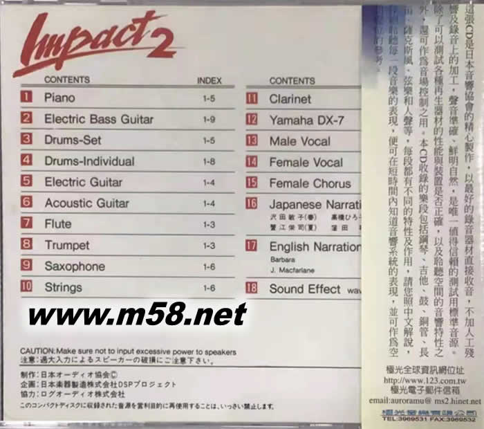 震撼二 日本音響協會最傲人的秘密武器RODUCED BY JAPAN AUDIO SOCIETY AS(m58.net) 震撼_-最逼真精凖的樂器音色 門機與調校器材必儲王碟 這張CD是日本音響協會的精心裂作·以最好的緣音器材直接收音·不加人工殘 響及錄音上的加工·聲音準確·鮮明自然·是唯一值得信賴的測試用標準音源