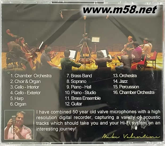 Mike Valentine (發燒Mike)從事錄音工作50多年,另一個專長是電影工作,尤其是一些高難度的拍攝及錄音工作,國際大電影對收音工作嚴謹,這麼一來、使他在錄音室中發揮出最大效益。這專輯共16首作品,使用了Flea M50 / U47拾音,他走到世界各地,在不同的場地,運用不同的擺咪方式,把每首作品,錄取成不同感覺。宏偉的音樂廳配大型管弦樂隊,土耳其伊玄密爾的小型俱樂部,最好是收錄爵士樂組合,還有是美麗的女聲,在宏偉的教堂唱出動人的聲音,奇妙的事發生在錄音中,太大意的人砰地關上前右門,這時候頓成閣下音響的考驗,聽到了嗎? 16首作品配上解說文字及圖片,記錄了發燒Mike對本專輯之誠意。