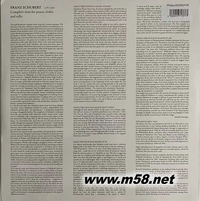 舒伯特三重奏全集(鋼琴 大提琴 小提琴) SCHUBERT COMPLETE TRIOS FOR PIANO VIOLIN AND CELLO 黑膠專輯背面圖片
