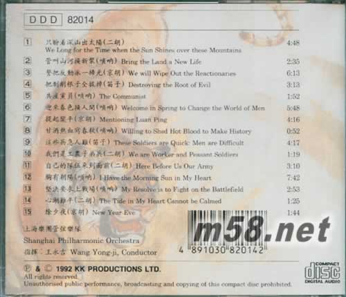 1.只盼著深山出太陽(二胡)We Long For The Time When The Sun Shines Over These Mountains 2.管叫山河換新裝(嗩吶) Bring The Land A New Life 3.誓把反動派一掃光(京胡)We Will Wipe Out The Reactionaries 4.把剝削根子全拔掉(笛子)DestroyingThe Root Of Evil 5.共產黨員(嗩吶)The Communist 6.迎來春風換人間(嗩吶)Welcome In SpringTo Change The World Of Men 7.提起樂平(京胡)Mentioning Luan Ping 8.甘酒熱血寫春秋(嗩吶)Willing To Shed Hot Blood To Make History 9.這些兵急人難(笛子)These Soldiers Are Quick: Men Are Difficult 10.我們是工家子弟兵(二胡)We Are Worker And Peasant Soldiers 11.自己的隊伍來到面前(二胡)Here Before Us Our Army 12.胸有朝陽(嗩吶)I Have The Morning Sun In My Heart 13.堅決要求上戰場(嗩吶)My Resolve Is To Fight On The Battlefield 14.心潮難平(二胡)The Tide In My Heart Cannot Be Calmed 15.除夕夜(京胡)New Year Eve