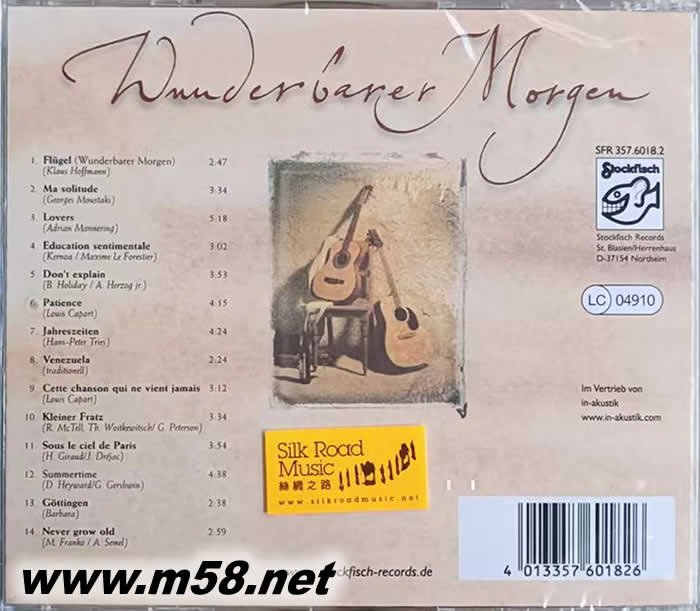 我們得向Stockfisch唱片公司的老闆Gunter Pauler脫帽致敬。這家唱片公司很特殊的只專精於一種領域,那就是民謠歌手。Stockfisch對於民謠音樂的熱忱是顯而易見的。他們不只是擅長發掘優秀的藝人,而是從製作、伴奏到錄音等方面都十分用心而專業。 先從藝人來說吧。Stockfisch旗下的藝人每個都是十八般武藝樣樣俱全,從演唱、寫詞、寫曲到演奏全都能一手包辦。十五首作品中只有三曲不是歌手自行創作,而所有的樂手都有在曲子中貢獻樂器的演奏。歌手詮釋自己的歌曲,當然都是「最佳版本」的演出。只有歌手自己的演奏音樂會顯得較為單調些,所以Stockfisch也培養了一個實力堅強的演奏、編曲團隊,像是Chris Jones、Mike Silver等人的吉他伴奏、Hans-Jorg Maucksch的貝斯演奏等等,在許多專輯中都可以聽到。而每張專輯中都包含了一些別出心裁的編曲,像是手風琴、打擊樂器、甚至德西馬琴、低音管等的演出,就像是大廚精心準備的醬料般,讓這些音樂充滿了迷人的風味。