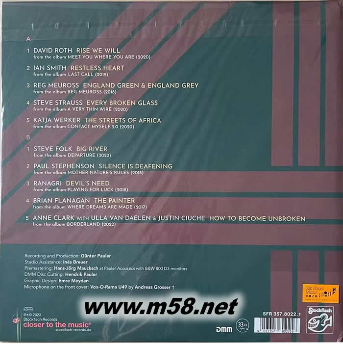 3. 專輯內(nèi)的十首歌曲分別來(lái)自大衛(wèi)‧羅斯(David Roth)、伊恩‧史密斯(Ian Smith)、雷格‧梅羅斯(Reg Meuross)、斯蒂芬‧斯特勞斯(Steven Strauss)、卡佳‧韋凱爾(Katja Werker)、史蒂夫‧福克(Steve Folk)、保羅‧斯蒂芬森(Paul Stephenson)、“瓦納格”樂(lè)隊(duì)(Ranagri)、布賴恩‧弗拉納根(Brian Flanagan)和安妮‧克拉克(Anne Clark)等,他們的風(fēng)格䢛異,但各具特色,加上每首歌曲旋律優(yōu)美動(dòng)聽,歌手們的表現(xiàn)亦異常出色,綜合成一張具示范作用的黑膠盤。