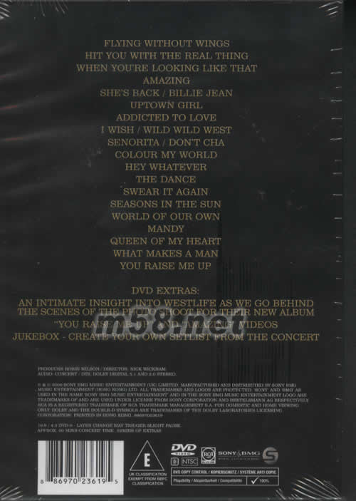 01. FLYING WITHOUT WINGS 02. HIT YOU WITH THE REAL THING 03. WHEN YOU'RE LOOKING LIKE THAT 04. AMAZING 05. SHE'S BACK /BILLIE JEAN 06. UPTOWN GIRL 07. ADDICTED TO LOVE 08. I WISH /WILD WILD WEST 09. SENORITA/DON'T CHA 10. COLOUR MY WORLD 11. HEY WHATEVER 12. THE DANCE 13. SWEAR IT AGAIN 14. SEASONS IN THE SUN 15. WORLD OF OUR OWN 16. MANDY 17. QUEEN OF MY HEART 18. WHAT MAKES A MAN 19. YOU RAISE ME UP DVD EXTRAS: AN INTIMATE INSIGHT INTO WESTLIFE AS WE GO BEHIND THE SCENES OF THE PHOTO SHOOT FOR THEIR NEW ALBUM "YOU RAISE ME UP" AND "AMAZING" VIDEOS JUKEBOX-CREATE YOUR OWN SETLIST FROM THE CONCERT