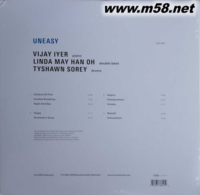 Uneasy 爵士三重奏 (鋼琴、貝斯、鼓) 黑膠(m58.net) Featured artists Vijay Iyer Piano Linda May Han Oh Double Bass Tyshawn Sorey Drums 鋼琴家 (Vijay Iyer) 創作音樂界的兩位關鍵人物鼓手Tyshawn Sorey與大提琴家Linda May Han Oh組成了光芒四射的爵士三重奏。 獲得格萊美提名的作曲家兼鋼琴家Vijay Iye被稱為今爵士樂界中最有趣、最有活力的年輕鋼琴家之一,時隔5年后的三重奏新專輯。是一張鋼琴三重奏組合如何相互對話、啟發、表達的范例。 2019年12月在紐約弗農山Oktaven音頻工作室錄制的《不安》。其它曲目包括20年來創作的Iyer原作 《不安》反映了我們時代的不平等和麻煩的社會政治狀況。全球社會普遍存在的動蕩、騷動和不平等的緊迫性——拋卻政治不提,光疫情就此起彼伏,年復一年……疫情下,維也納新年音樂會、東京奧運會都無現場觀眾,好不凄涼。確實令人不安。
