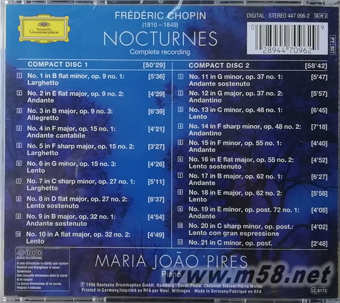 蕭邦:夜曲全集Chopin:Nocturnes(古典愛好者必備)(m58.net) 《企鵝古典唱片指南》推薦:瑪利亞·胡奧·皮爾斯 - 肖邦:夜曲全集 / Maria Joao Pires - Chopin: Nocturne 盒裝雙CD(DGCD4470962 ) 皮爾斯的《肖邦:夜曲全集》,2009年《企鵝古典唱片指南》推薦為三星。 皮爾斯(Maria Joao Pires):1944年出生于葡萄亞首都里斯本,自幼即嶄露了音樂才華,9歲時就在葡萄牙年輕音樂家的甄選會中榮獲第一名,并進入里斯本音樂院就讀。1970年她在布魯塞爾舉辦的貝多芬國際鋼琴大賽中奪魁,開始受到國際矚目,不久即被法國Erato公司網羅,灌錄莫扎特鋼琴協奏曲,進入優秀莫扎特演奏家的行列。1974年她應日本哥倫比亞公司之邀,以一個半月的時間,完成這套全球首次以數碼技術錄制的莫扎特奏鳴曲全集。發行之后獲得1976年的法國唱片大獎以及1977年的愛迪生大獎,皮爾斯在國際間的名聲因而扶搖直上,目前則是樂壇上最令人期待的女性鋼琴家。 “夜曲”是肖邦創新的一種鋼琴獨奏體裁,它具有恬淡平和,寂靜幽瀾的特點,輕緩中偶爾透著那么一點點沉思。要想認識鋼琴詩人的浪漫氣質,領略鋼琴詩的獨特韻致,肖邦的作品是當之無愧的首選。肖邦似乎就是為鋼琴而生的,在他的指下,鋼琴以獨有的聲音詩意地吟唱起來,音樂的個性與鋼琴的特性如水乳交融一樣和諧。