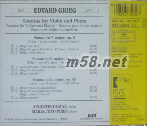 Beethoven Complete Violin Sonatas貝多芬小提琴+鋼琴奏鳴曲全集(m58.net) Maria Joao Pires: 葡萄牙女鋼琴家,4歲首次登臺,6歲舉行獨奏會,被稱為神童,9歲參加里斯本國際鋼琴比賽獲第一名,16歲在里斯本音樂學院畢業后在柏林參加國際青年鋼琴比賽獲第二名,同年在李斯特鋼琴比賽獲第一名。隨后到慕尼黑留學,師從恩格爾繼續深造1970年紀念貝多芬誕生200周年,在布魯塞爾舉辦的貝多芬鋼琴比賽獲第一名,從而受到矚目。皮爾斯以精湛的演奏技藝和獨特的藝術處理方式,成為眾多著名鋼琴家中的一位佼佼者,其演奏不像巴西女鋼琴家奧爾蒂斯那樣輕柔灑脫,而以細膩、典雅、秀麗、嫵媚而享譽世界。皮爾斯的演奏,音色極美,又善于在節奏與分句處理上表現出細微的變化。皮爾斯擅長演奏莫扎特和肖邦的作品,其演奏和錄制的莫扎特鋼琴奏鳴曲、肖邦前奏曲集散發出濃郁的法國沙龍氣息。而肖邦夜曲則在浪漫氣氛里,蘊涵著些許陰柔。她與小提琴家杜梅組成的二重奏,是目前活躍在世界樂壇的最佳組合,深得各種媒體和樂迷們的好評。她和杜梅、王建一起,已形成室內樂的最佳搭檔,演繹的室內樂作品有一種清新的美感。 Augustin Dumay : 奧古斯汀 杜美出生于1949年01月17日的法國巴黎,是一位著名小提琴演奏家。當他十歲進入巴黎音樂院,兩年后離開學校跟隨私人教師繼續學習小提琴的演奏。在他 14歲那年,他參加了蒙特勒藝術節的演出,逐漸被人們熟識,并成為著名的小提琴演奏家。米爾斯坦預測,本世紀末杜將成為世界上最偉大的小提琴家。