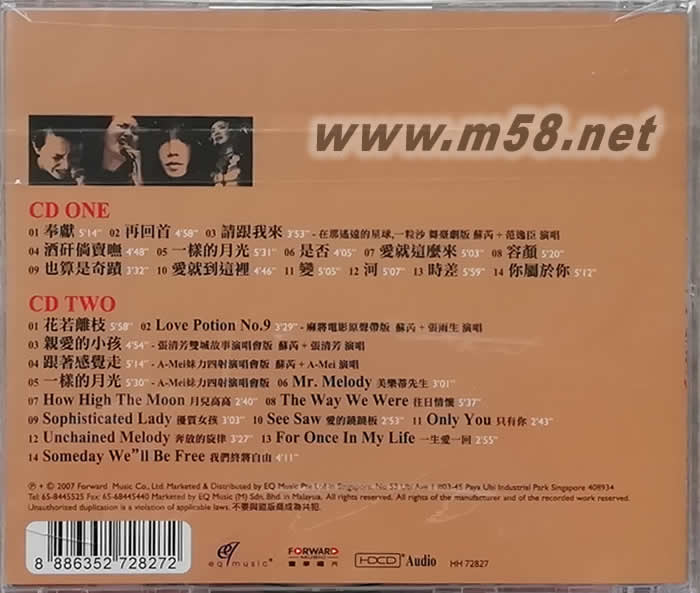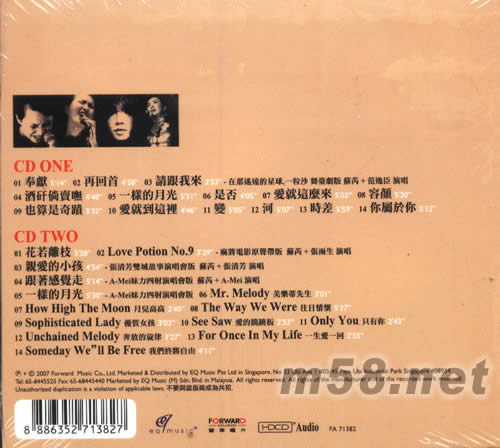 CD ONE 01. 奉獻 02. 再回首 03. 請跟我來 -在那遙遠的星球,一粒沙 舞臺劇版 蘇芮+范逸臣演唱 04. 酒矸倘賣無 05. 一樣的月光 06. 是否 07. 愛就這么來 08. 容顏 09. 也算是奇跡 10. 愛就到這里 11. 變 12. 河 13. 時差 14. 你屬于你 CD TWO 01. 花若離枝 02. LOVE POTION NO.9 -麻將電影原聲帶版 蘇芮+張雨生 演唱 03. 親愛的小孩 -張清芳雙城故事演唱會版 蘇芮+張清芳 演唱 04. 跟著感覺走 -A-MEI妹力四射演唱會版 蘇芮+A-MEI 演唱 05. 一樣的月光 -A-MEI妹力四射演唱會版 06. MR.MELODY 美樂蒂先生 07. How High The Moon 月兒高高 08. The Way We Were 往日情懷 09. Sophisticated Lady 優(yōu)質(zhì)女孩 10. See Saw 愛的蹺蹺板 11. Only You 只有你 12. Unchained Melody 奔放的旋律 13. For Once In My Life 一生愛一回 14. Someday We'll Be Free 我們終將自由