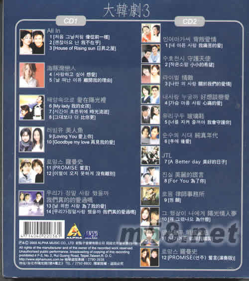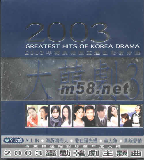 2003大韓劇3 韓劇暢銷主題曲(m58.net) 完全收錄ALL IN 海豚灣戀人 愛在陽光里 美人魚 背叛愛情 百萬韓迷絕對(duì)珍藏年度大碟 2003轟動(dòng)韓劇主題曲