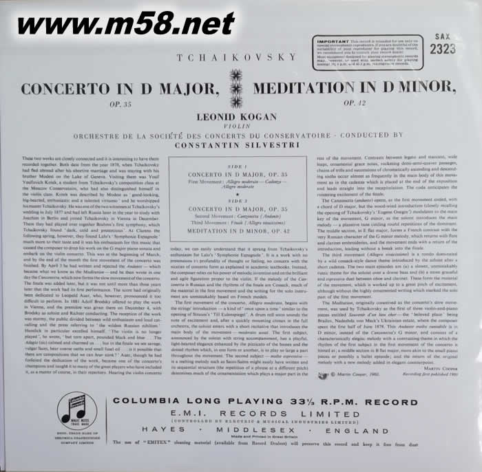 柴可夫斯基:小提琴協奏曲,沉思曲 TCHAIKOVSKY VIOLIN CONCERT 黑膠專輯背面圖片