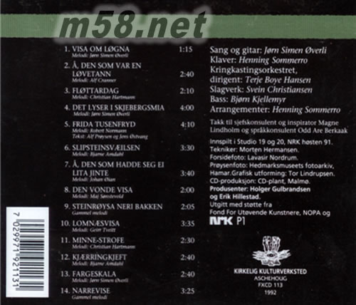 01 - Jorn Simen Overli - Vise on logna 02 - Jorn Simen Overli - A,den som var en lovetann 03 - Jorn Simen Overli - Flottardag 04 - Jorn Simen Overli - Det lyser i Skjebergsmia 05 - Jorn Simen Overli - Frida Tusenfryd 06 - Jorn Simen Overli - Slipstensvalsen 07 - Jorn Simen Overli - A,den som hadde seg ei lita jinte 08 - Jorn Simen Overli - Den vonde visa 09 - Jorn Simen Overli - Steinroysa neri bakken 10 - Jorn Simen Overli - Lomnasvisa 11 - Jorn Simen Overli - Minne-strofe 12 - Jorn Simen Overli - Kjarringkjeft 13 - Jorn Simen Overli - Fargeskala 14 - Jorn Simen Overli - Narrevise