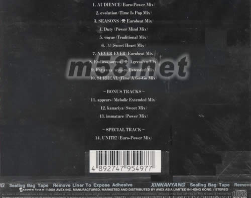 1.AUDIENCE (EURO-POWER MIX) 2.EVOLUTION(TIME IS POP MIX)] 3.SEASONS (& EUROBEAT MIX) 4.DUTY (POWER MIND MIX) 5.VOGUE (TRADITIONAL MIX) 6.M(SWEET HEART MIX) 7.NEVER EVER (EUROBEAT MIX) 8.ENDLESS SORROW(&AGRESSIVE MIX) 9.RAR AWAY (AYU-RO EXTENDED MIX) 10.SUOOEAL (TIME A GO-GO MIX) 11.APPEARS (MELODIE EXTENDED MIX) 12.KANARIYA ()SWEET IMX 13.IMMATURE (POWER MIX0) ~SPECLAL TRACK~ 14.UNITE!(EURO-POWER MIX)