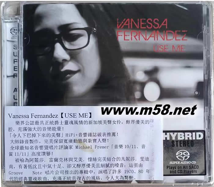 Use Me 令人驚嘆的聲音 SACD(m58.net) 樂界公認最具正統爵士靈魂風情的新加坡美聲女伶,醇厚優美的唱腔,充滿強大的音樂能量! ★「令人下巴掉下來的美聲」HiFi+音響雜誌破表推薦! ★ 大師錄音製作,完美保留寬廣動態與扎實人聲! ★ 全球最知名音響暨唱片評論家 Michael Fremer「音樂 10/11、音質 11/11」高度讚譽! 被喻為阿麗莎.富蘭克林與艾美.懷絲完美結合的凡妮莎.斐迪南,有著低沈且中氣十足、卻又醇厚優美且細膩的嗓音;這張由 Groove Note 唱片公司推出的專輯中,她在原音樂器純凈自然的伴奏下,演唱了許多 1970、80 年代的經典靈魂歌曲,充滿正統且復古的風格,令人大為驚艷。 這張由 Bernie Grundman 以類比真空管系統剪輯而成的作品,有著極為驚人的優異錄音效果,寬闊的音場中完美舒展出各種樂器的微小細節音色,人聲更是細膩而立體,最高品質 SACD 壓片更使得絕佳的錄音效果得以全面綻放。且相對於其他發燒片,本片的音樂性更是獲得評論者極高的讚譽,除卻凡妮莎.斐迪南本身高超的歌唱技巧,一群洛杉磯優秀音樂家的演出,更讓整體音樂充滿活力與獨特的生命,不僅是測試系統的最佳選擇,更是一份值得珍藏的藝術杰作!