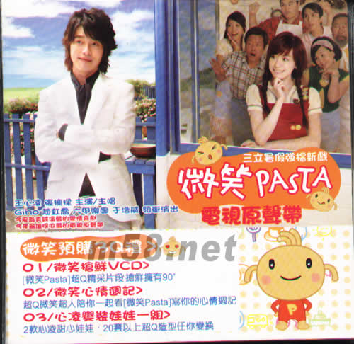贈品先到。 王心凌 張棟粱 主演/主唱 GINO趙虹喬 六甲樂團 于浩威 領銜演出 今夏最真誠溫馨的愛情喜劇 今年最值得收藏的電視原聲帶 微笑預期購3Q禮 1.微笑搶鮮 VCD [微笑PASTA]超Q精彩片段搶鮮擁有90 2.微笑心情周記 超Q微笑超人陪你一起看[微笑PASTA]寫你的心情周記 3.心凌變裝娃娃一組 2款心凌甜心娃娃,20套以上超Q造型任你變換