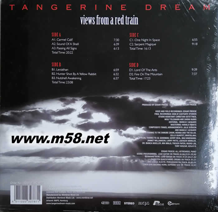 VIEWS FROM A RED TRAIN 電子樂(lè) 雙黑膠(m58.net) 由艾加伏羅西在1967年創(chuàng)立於柏林的「蜜柑夢(mèng)」樂(lè)團(tuán),最早以超現(xiàn)實(shí)搖滾樂(lè)隊(duì)的姿態(tài)起家,逐漸蛻變?yōu)?0年代以來(lái)全球最頂尖的電子音樂(lè)先鋒,他們推出過(guò)上百?gòu)垖]嫽蜻x集,從空靈的新世紀(jì)、磅礡的太空音樂(lè)到節(jié)奏強(qiáng)勁的電子舞曲,表現(xiàn)都令人讚嘆,並曾為「勢(shì)如破竹」、「留校察看」等二十多部電影製作配樂(lè),豐富的創(chuàng)意與技巧,為樂(lè)壇帶來(lái)極大的衝擊