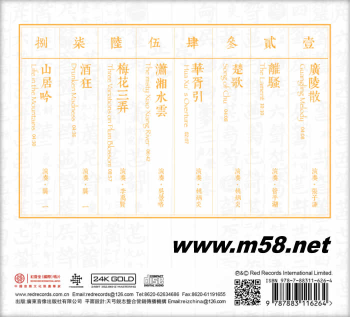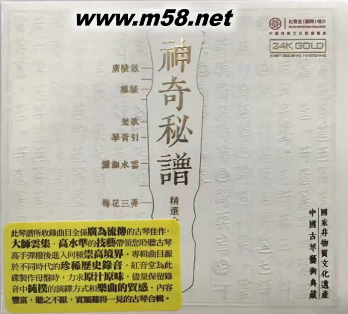 神奇秘譜 古琴大師合輯 24K GOLD CD 金碟(m58.net) 神奇秘譜是明太祖之子朱權編纂的古琴譜集,成書於明初洪熙乙巳(西元1425年),是現存最早的漢族琴曲專集。書中所收六十四首琴曲是編者從當時『琴譜數家所裁者千有余曲』中精選出來的,其中頗有一些歷史上很有影響力的名作。由於古代漢族音樂不如其他文物那樣便於保存,所以許多古曲不是失傳了,就是面目全非,因此古琴譜中保存的古曲,被唐人認為『唯彈琴家猶傳楚漢舊聲』。古曲是總結前人音樂創作經驗,探索傳統音樂規律所不可缺少的依據。《神奇秘譜》全書共分三卷。上卷稱《太古神品》,收十六首作品。在各曲之前都寫有詳盡的題解,將琴曲的淵源演變情況和樂曲的表現內容作了介紹,段落、指法、音位也標寫的很清楚。此譜是研究古琴音樂的重要資料,具有很高的使用價值和史料價值。